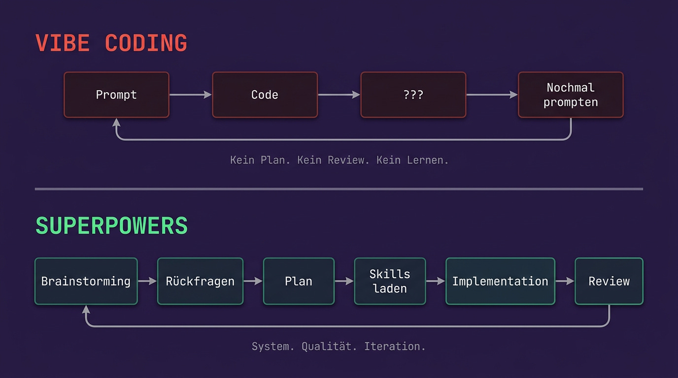 Für mich war der Superpowers-Workflow in Claude Code der Startpunkt. Spec-driven statt prompten und hoffen.