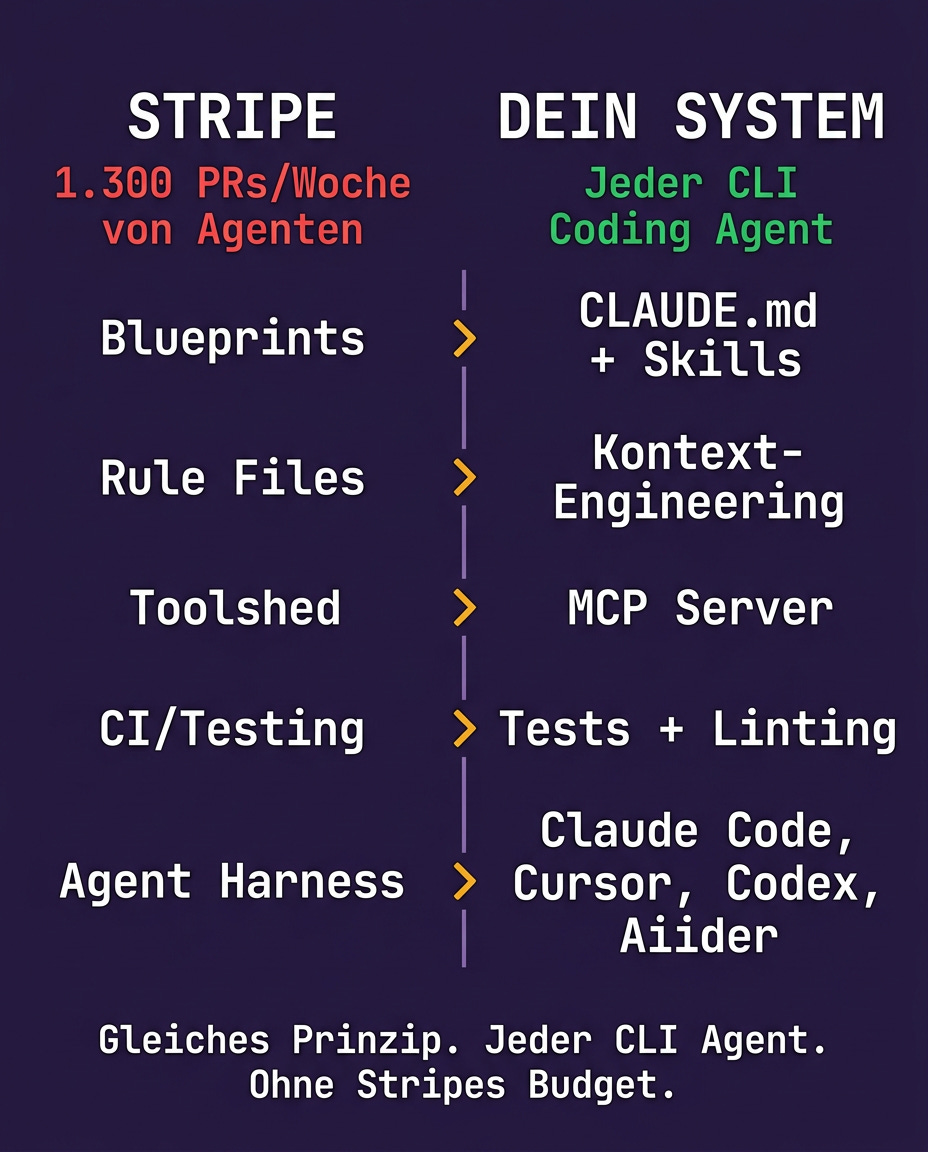 Guck dir nochmal an was Stripe macht. Die haben nicht Cursor oder Claude Code out of the box genommen und gehofft. Die haben ihr eigenes System drumherum gebaut. Eigene Blueprints. Eigene Rule Files. Eigene MCP Tools. Und dann das gleiche Regelsystem über alle drei Plattformen synchronisiert.