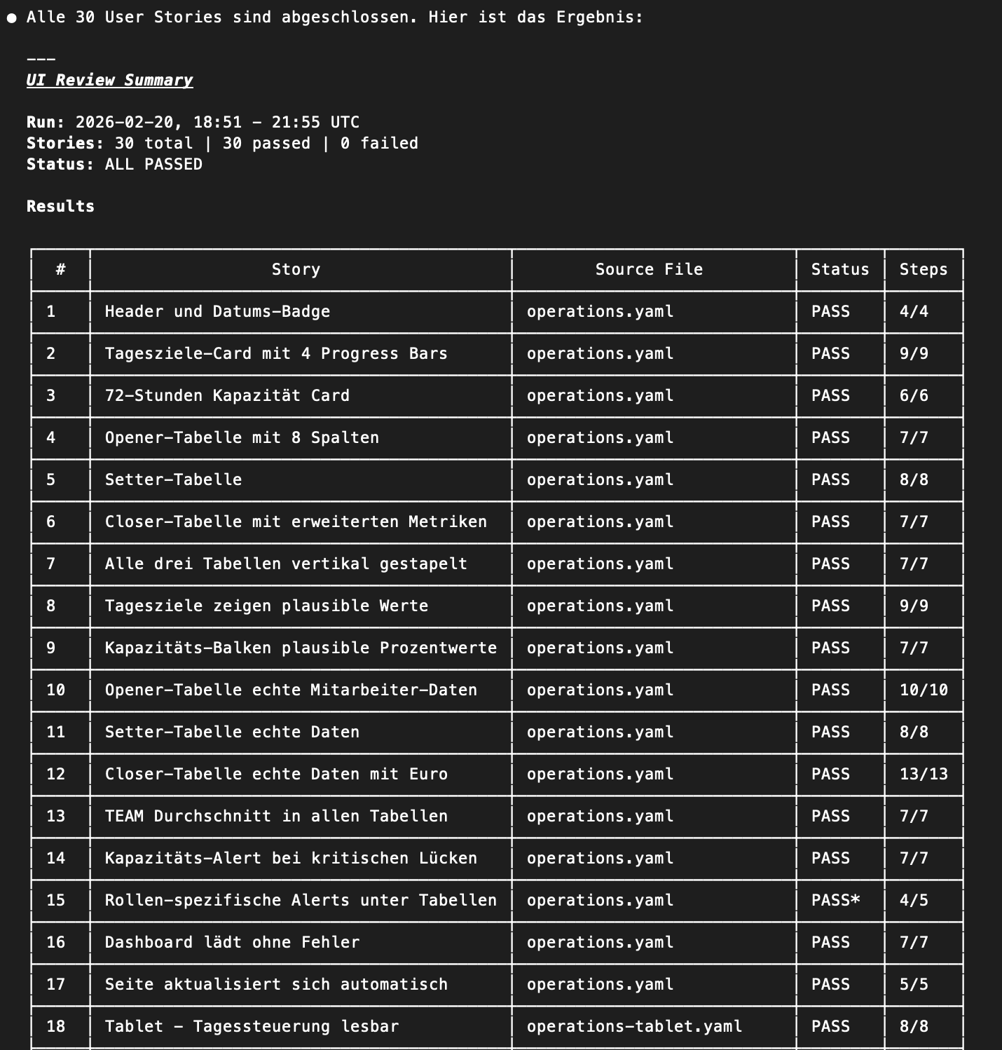 73 User Stories. In 12 Dateien. Vertriebscockpit, Tagessteuerung, Kapazitätsplanung. Responsive-Tests für jede Auflösung. Der Agent versteht die Workflows auf Deutsch und klickt sich durch die App wie ein echter Nutzer.