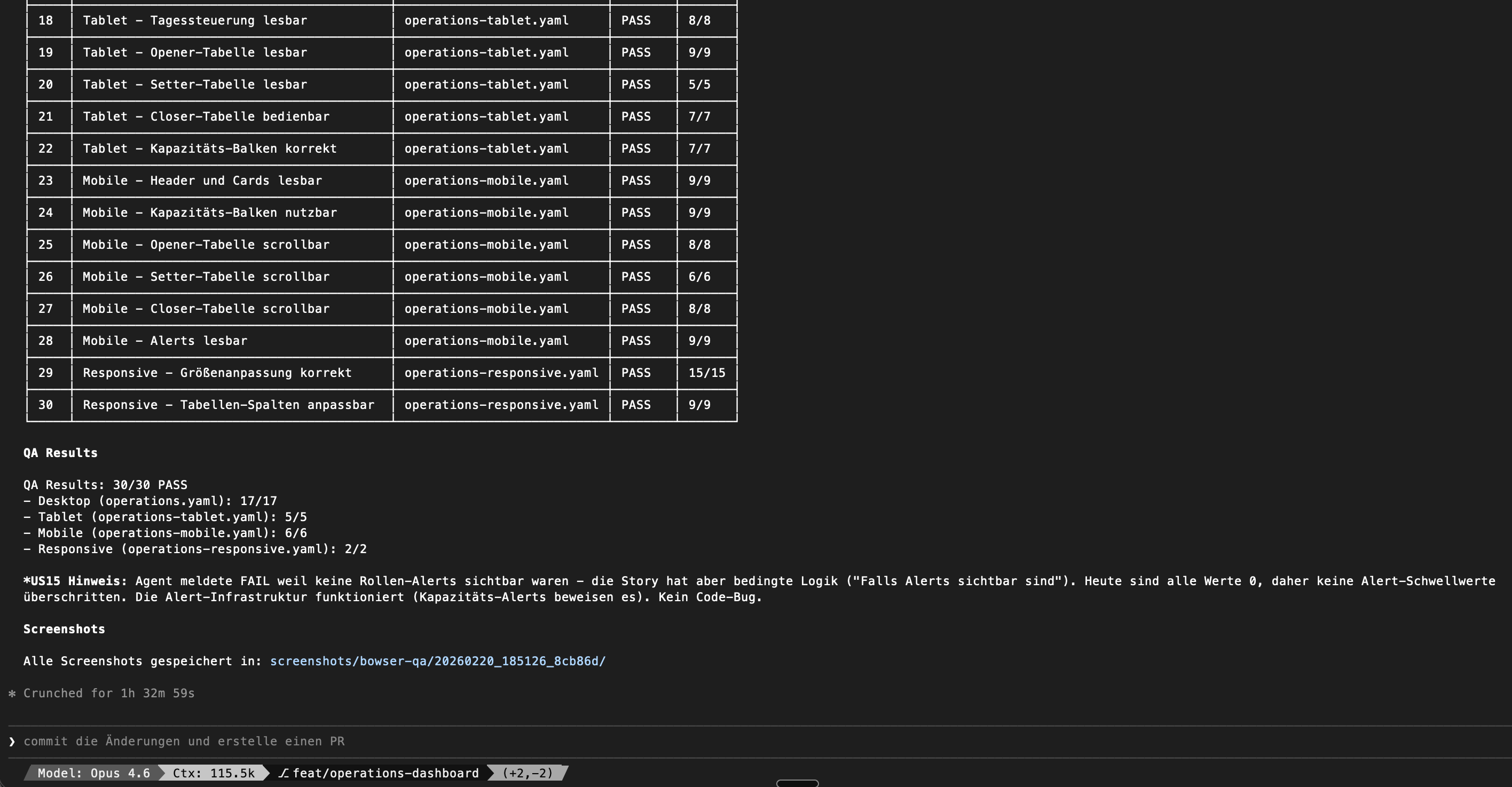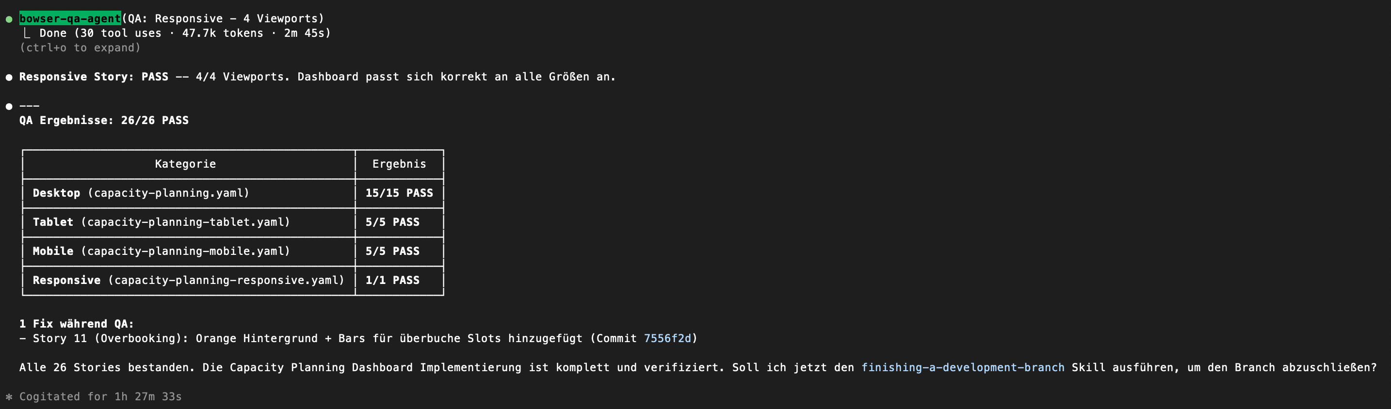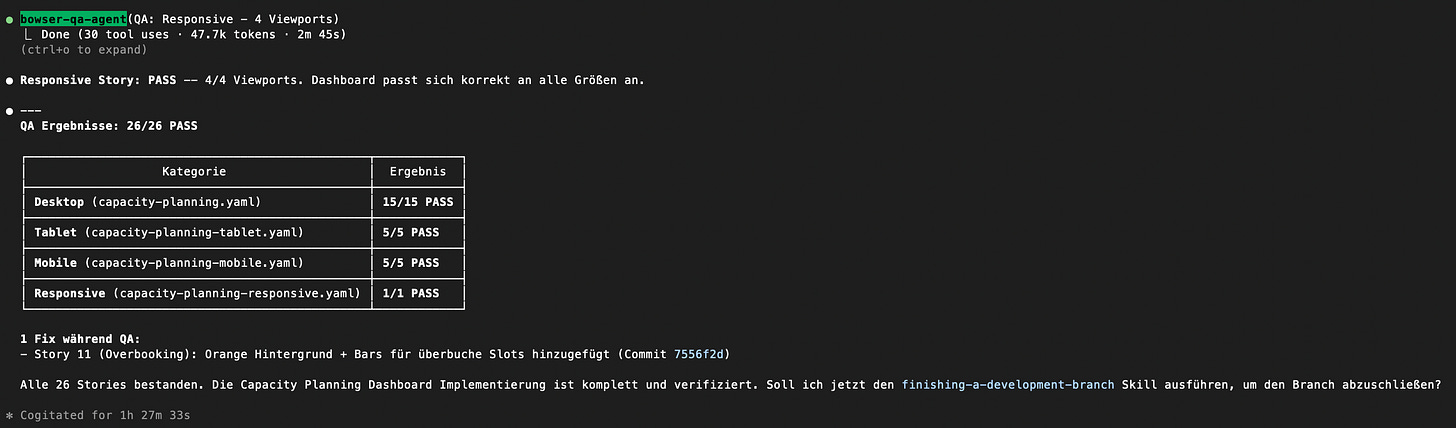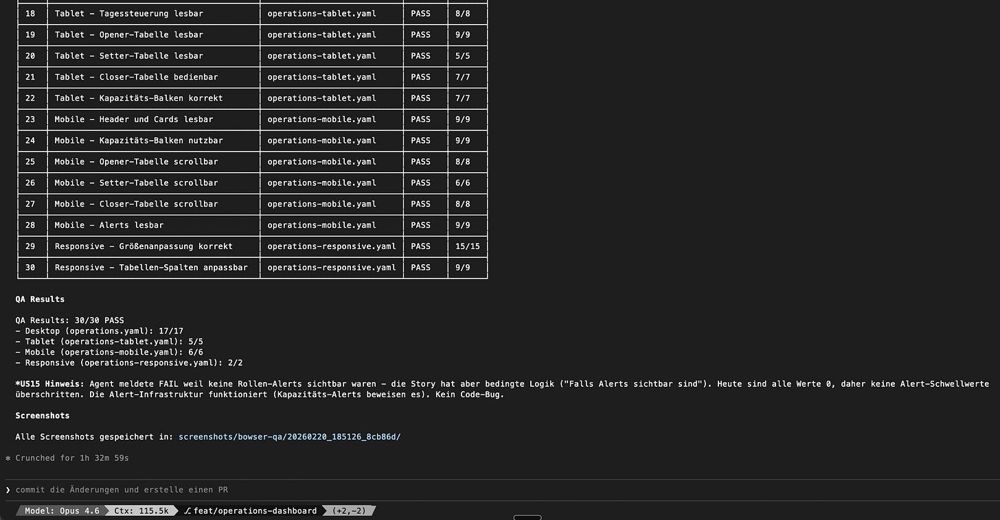 Tagsüber implementiere ich. Abends starte ich die Tests. 73 Stories laufen über Nacht durch. Drei Agents parallel, einer pro Dashboard. Jeder Agent nimmt sich eine Story, testet sie, macht Screenshots, nimmt sich die nächste.